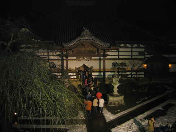 新しくなった本堂が檀信徒の方のご好意で、明るくライトアップされました。 新しい年を迎えるために多くの人々が参拝に訪れてくれました。 行く年を思い、来る年に願いを込めて鐘をついていく親子の姿が 微笑ましく、何をお願いしたのでしょうか。 雨交じりの雪が降りましたが、かがり火を囲みながら、甘酒を 酌み交わし、談笑しておりました。