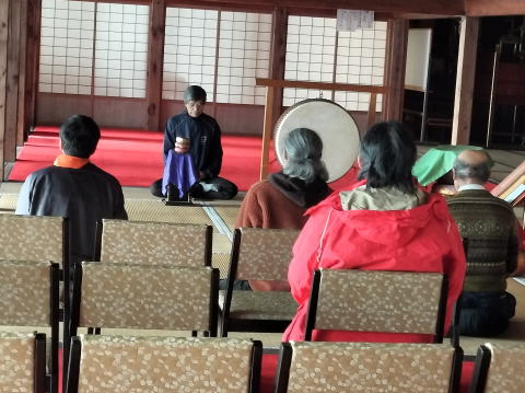 秋晴れの清々しい一日、座禅会と村の茶道倶楽部{シャガ}との座禅会とお茶会が開かれました。 座禅会は有志の人々が毎月第二土曜日に集まり、住職が檀務で居なくても自由に座っています。1時半より3時まで行っています。ご希望の方はいつでも参加できます。椅子座禅もありますので座らなくても出来ます。 |