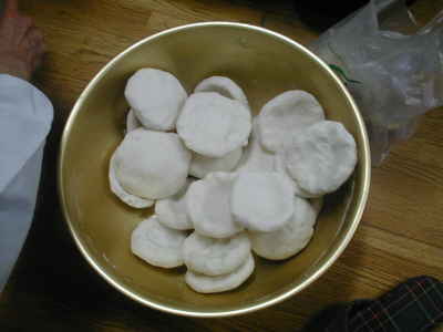 1.米の粉は熱湯でこね、小さくうすくまとめてゆでる。10分から15分ぐらい。