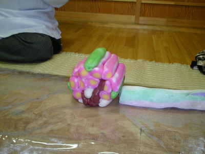 3.色物をつくる。 茶色・・緑 1、赤 6、黄 3の割合でこねる。